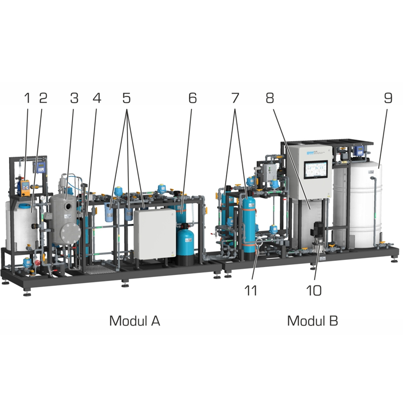 All main components comply with industrial standards and allow maintenance tasks to be carried out and documented in a practical manner. This includes backwashing filters, regenerating ion exchangers, and cleaning, installing and removing plant components.